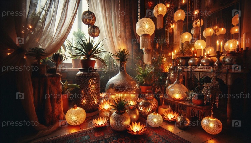 Интерьер в стиле бохо, стеклянные террариумы с воздушными растениями Tillandsia и увлажнителем, Ai generated image