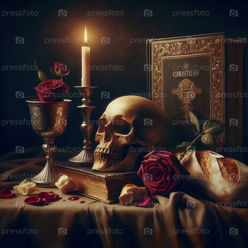A vanitas sacra натюрморт с черепом и Евхаристией, Ai generated image