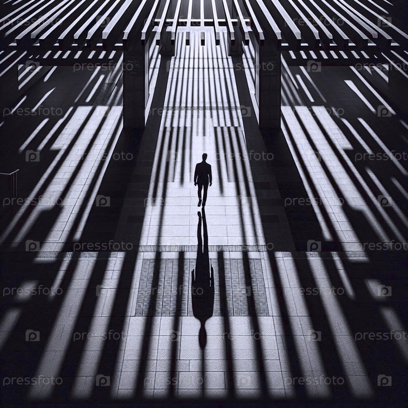 Одинокая фигура в шляпе с широкими краями, идущая по коридору ярких, повторяющихся теней из перголы, Ай создала образ
