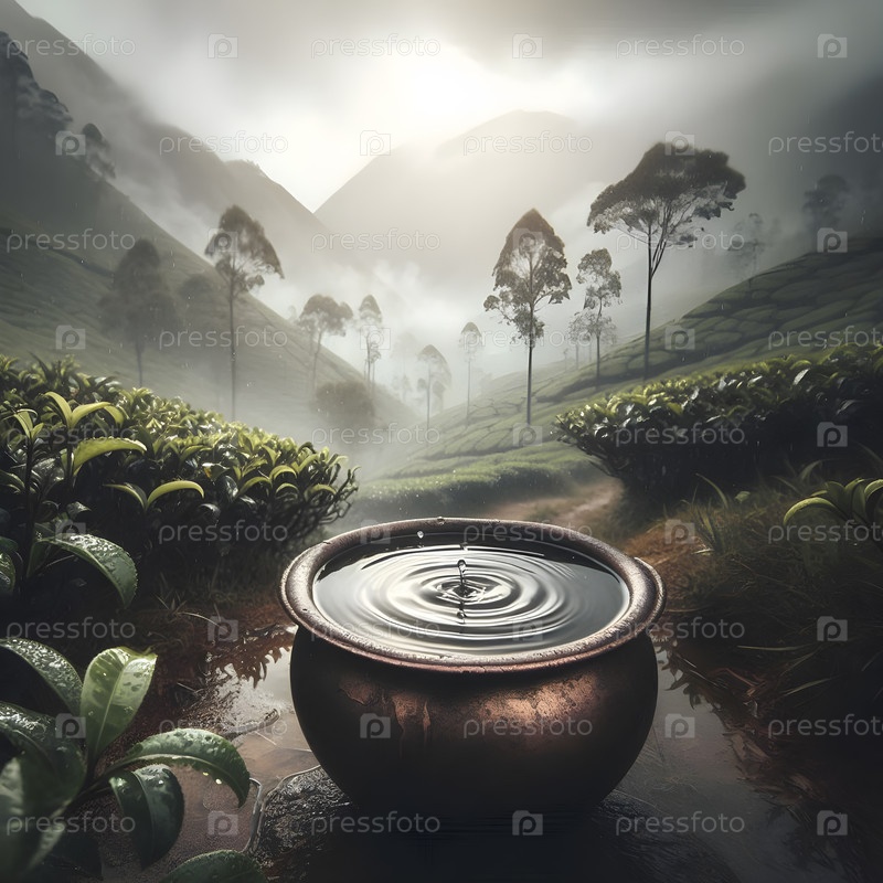 Дождевая вода, собранная в бронзовом сосуде, Ai created image
