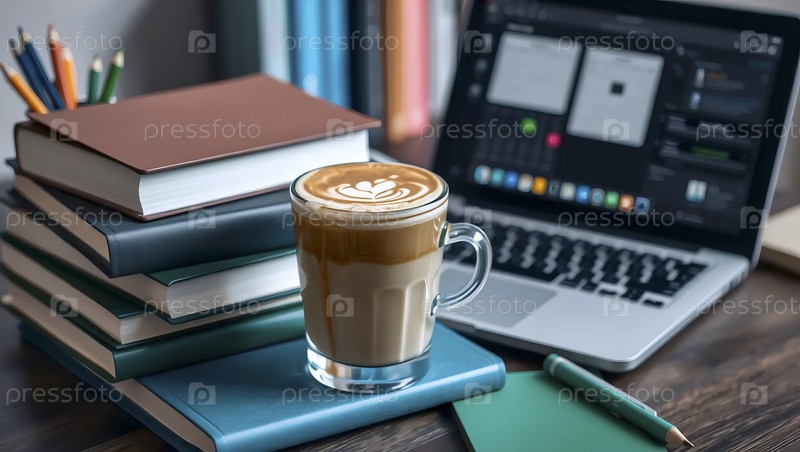 Искусство, ноутбук с чашкой кофе, Ai generated image Lat
