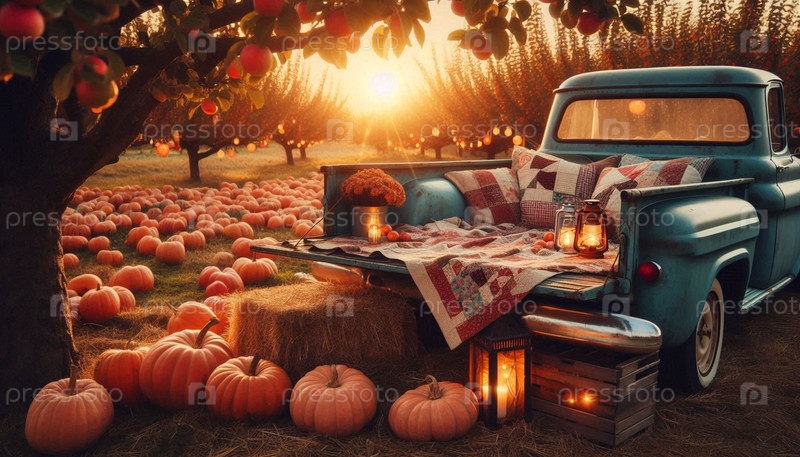 Осеннее тыквенное поле на закате с пикапом, Ai generated image