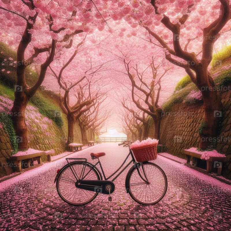 Весенний тоннель с винтажным велосипедом, Ai generated image
