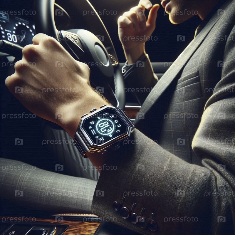 Близкий план запястья мужчины, носящего изысканные, новые электрические наручные часы с цифровым показателем, его рука опирается на руль современного автомобиля