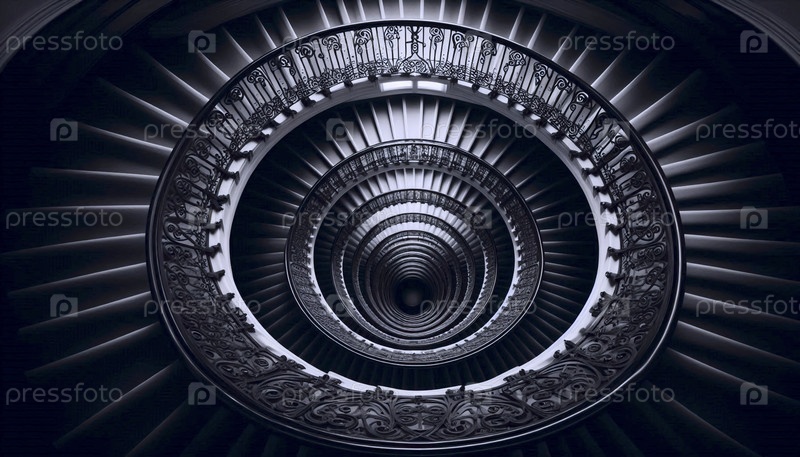 Геометрическая абстракция спиральной лестницы, сделанная непосредственно сверху и создающая гипнотический вихревой рисунок, Ai generated image