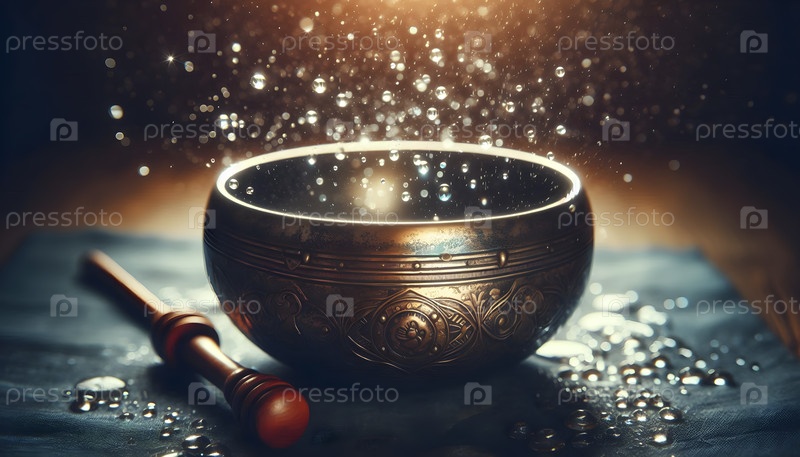 Тибетская певческая чаша, вибрирующая капельками воды, Ai created image