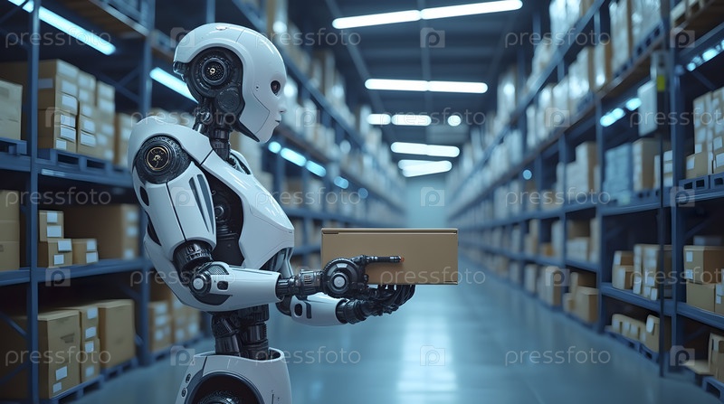 Футуристический склад с автономными роботами, сортирующими пакеты, Ai generated image