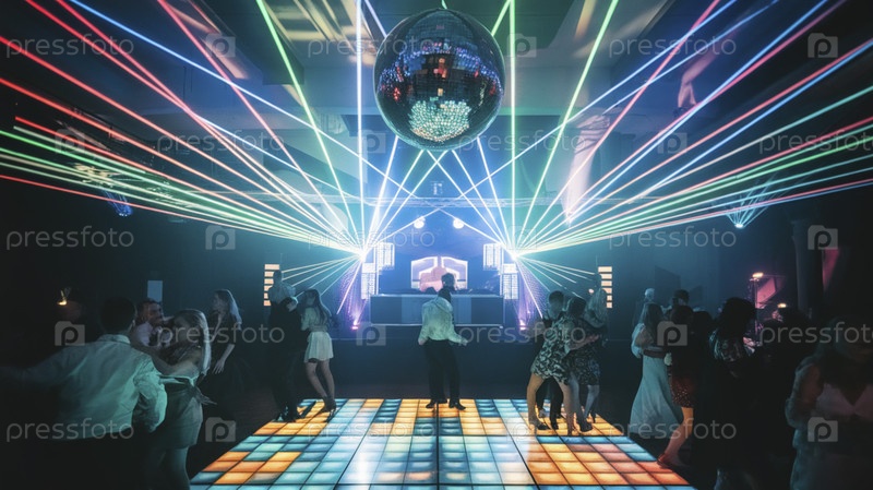 Сцена в ночном клубе с одним гигантским дискотечным шаром, отражающим красочные лазерные лучи во всех направлениях, Ai generated image