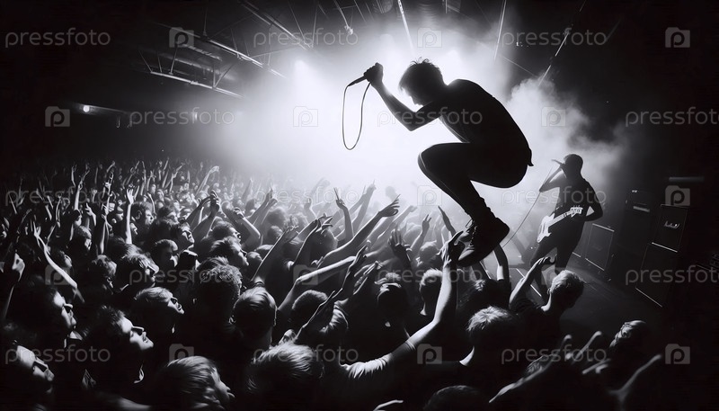 Динамичный, зернистый кадр панк-рок концерта, захватывающий музыканта в середине прыжка и размытой толпы, Ai создал изображение