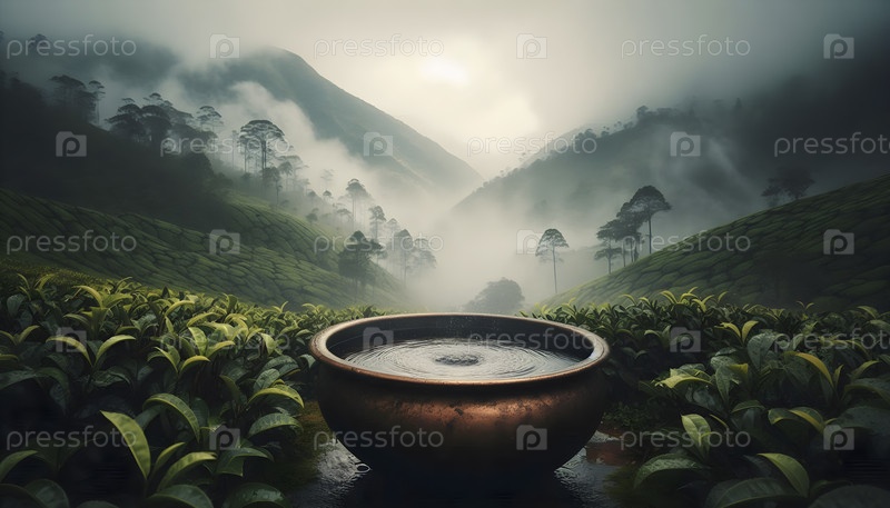 Дождевая вода, собранная в бронзовом сосуде, Ai created image