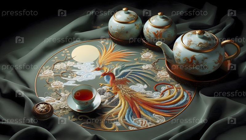 Шелковая вышивка феникса рядом с чайным набором из целадона, Ai created image