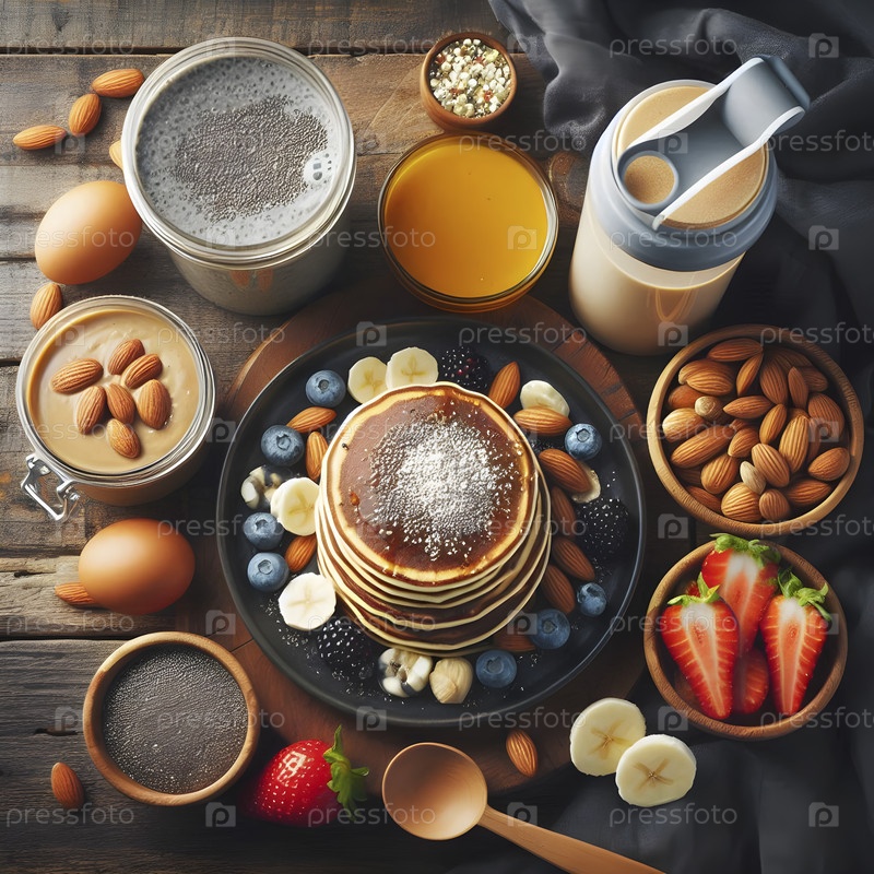 Верхний вид фитнес-завтрака: протеиновые блины с миндальным маслом, чиа пудингом и бутылкой для шейкеров, Ai created image