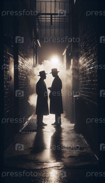 Секретный разговор между двумя мужчинами в шляпах, их лица скрыты под тентом мокрой аллеи, создал изображение Ай