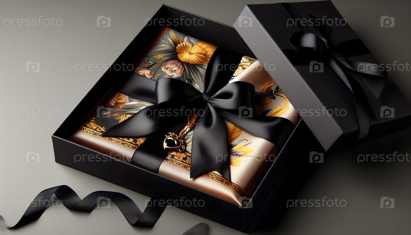Шелковый шарф в глянцевой черной коробке, изображение создано AI