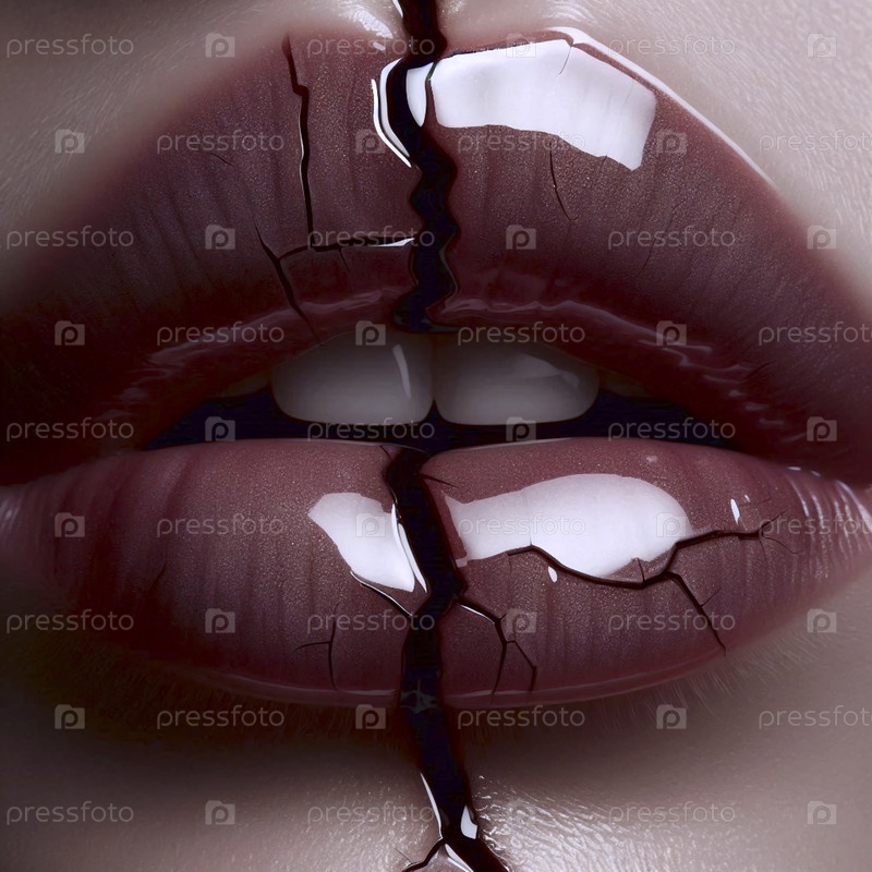Губы человека в экстремальном крупном плане, покрытые блестящим веществом с одной идеальной трещиной, проходящей сквозь него, Ai создали изображение