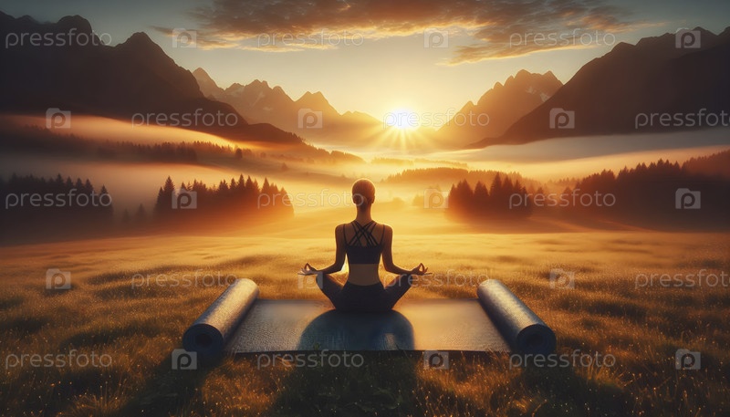 На рассвете йога-матка на розовой траве с видом на туманные горы, Ai created image