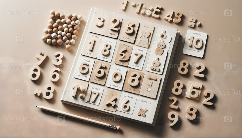 Книга с подсчетом для детей, отображаемая вместе с карточками чисел и деревянными жемчужинами, Ai created image