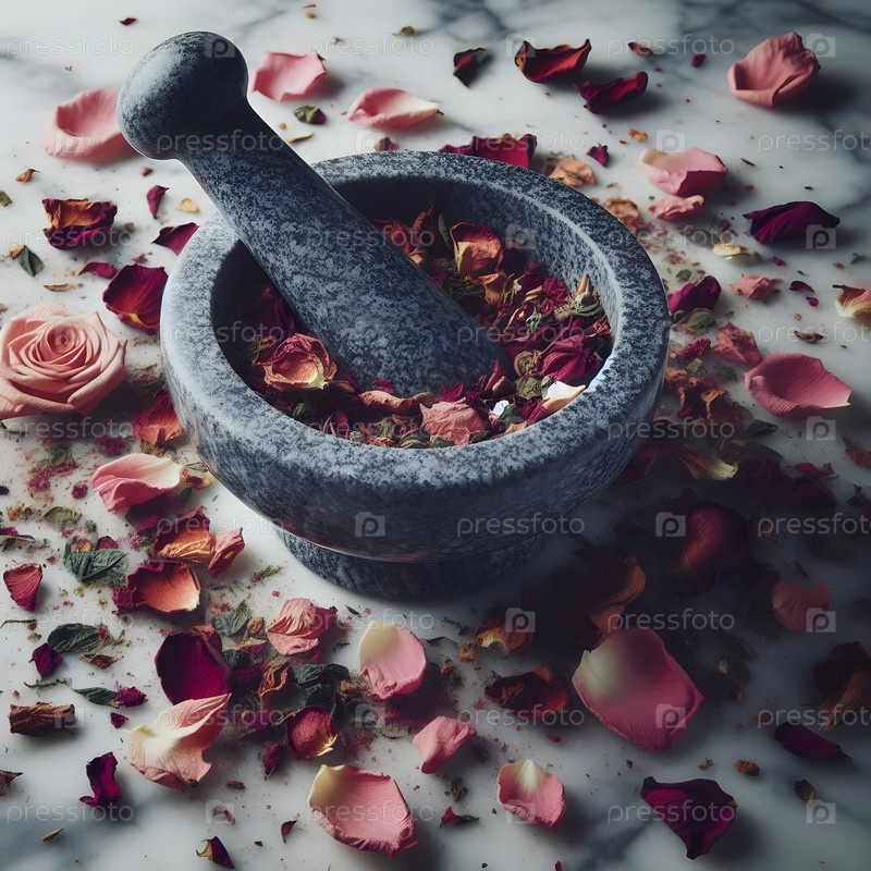 Молотком и пистолетом, измельчая сушеные листья роз в порошок, Ai created image