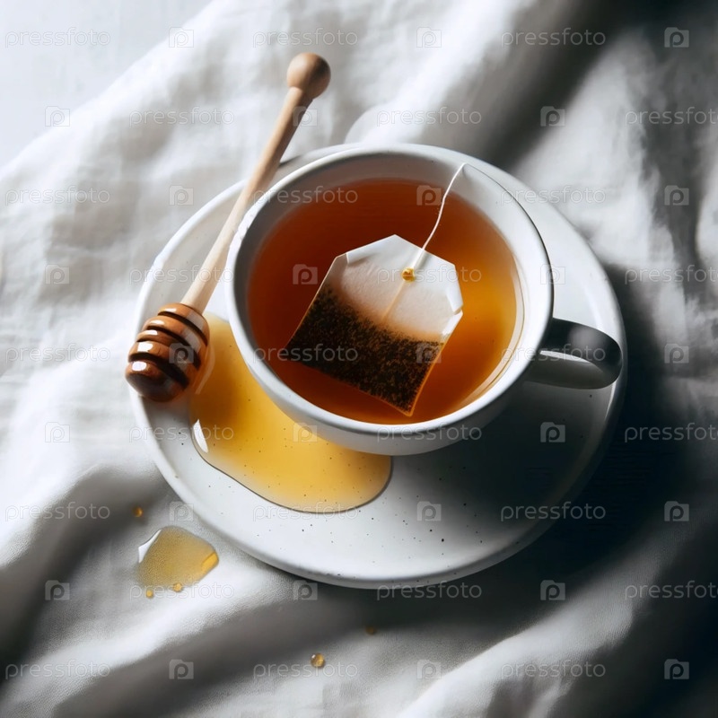 Чайный пакет на тарелке с медовой каплей, Ai generated image