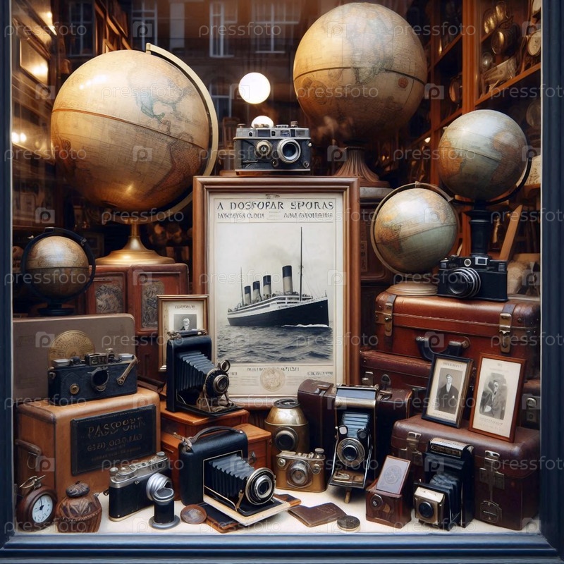 Антикварные витрины с туристическими реликвиями, Ai generated image