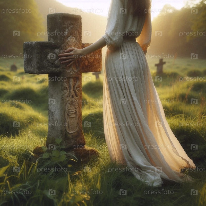 Фигура сзади, касающаяся выветрившийся каменный крест в поле, Ai generated image