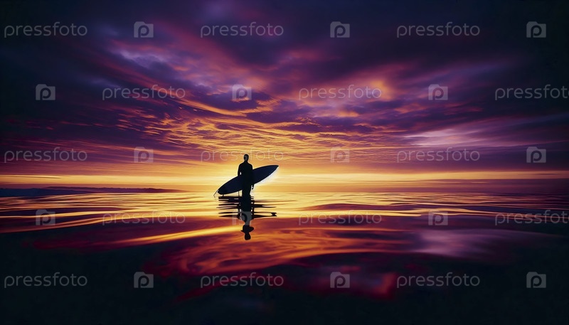 Сёрфер, ожидающий волн, сидящий на своей доске в обширном плоском океане под огромным красочным восходящим небом, создал изображение Ai