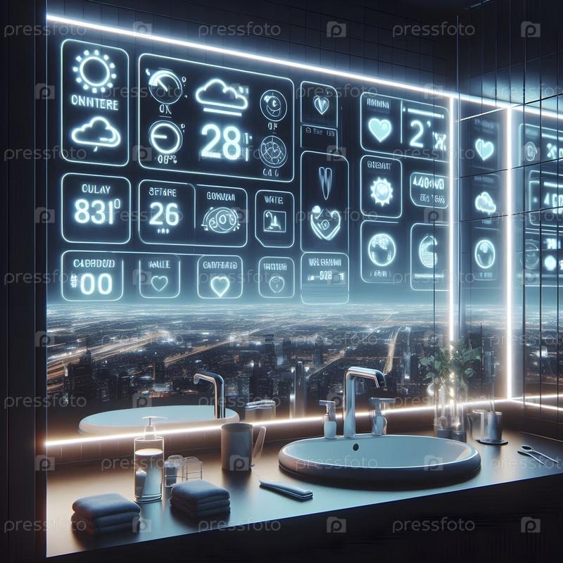 Зеркало ванной комнаты, отображающее данные о погоде и статистику здоровья, Ai created image