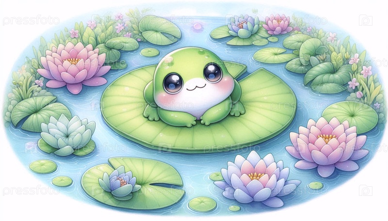 Кавайская сцена лягушки на подложке лилии, Ai generated image