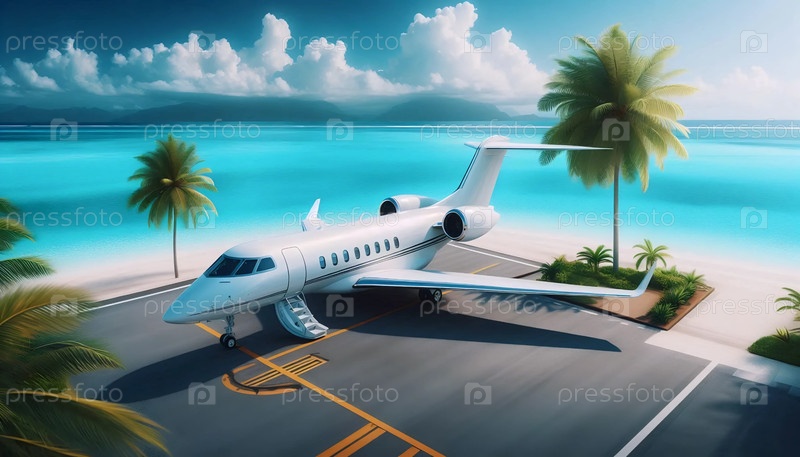Вид с дронов частного самолета на тропической взлетно-посадочной полосе, Ai generated image