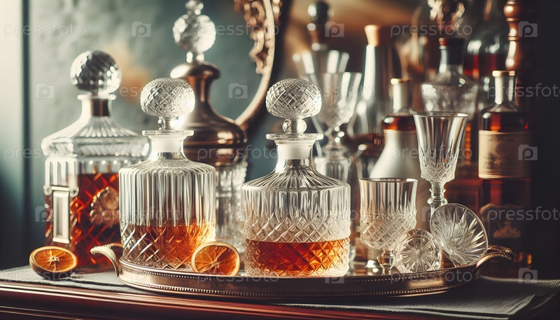 Комплект кристаллических декантеров с очками, изображение, созданное AI