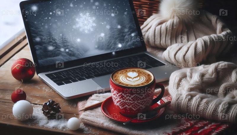 Искусство, ноутбук с чашкой кофе, Ai generated image Lat