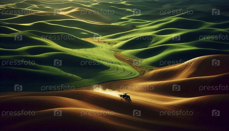 Фермер, управляющий трактором через массивную холмистую местность в волшебный час, с пейзажем, купающимся в мягком направленном свете, Ай создал изображение