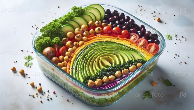 Стеклянная коробка для блюд со слойной чашей Будды: авокадо, горох и капуста, Ai created image