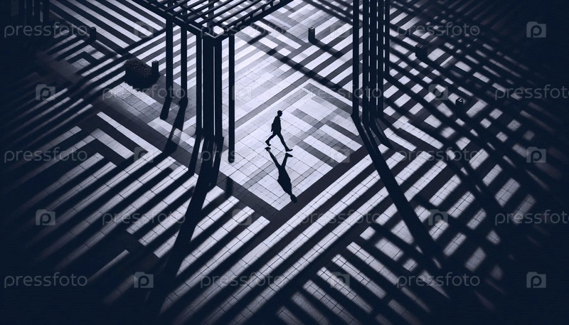 Одинокая фигура в шляпе с широкими краями, идущая по коридору ярких, повторяющихся теней из перголы, Ай создала образ