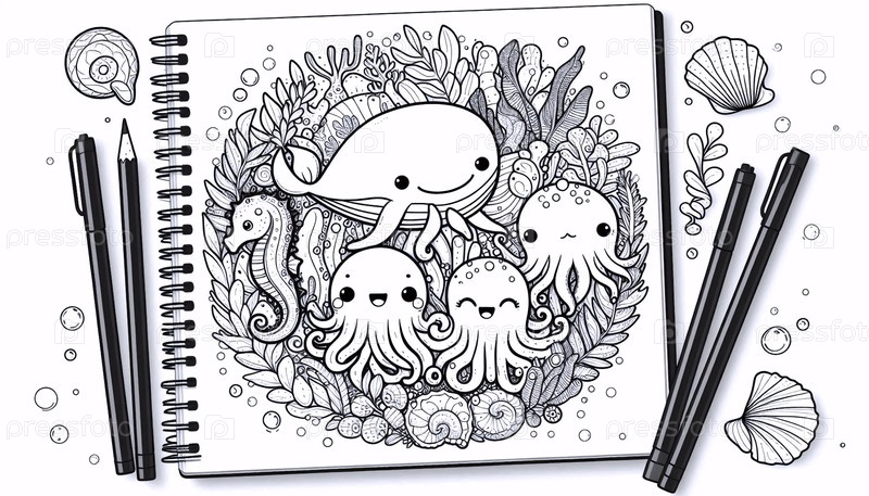 A kawaii ocean creatures цветная страница в круговом формате, Ai generated image