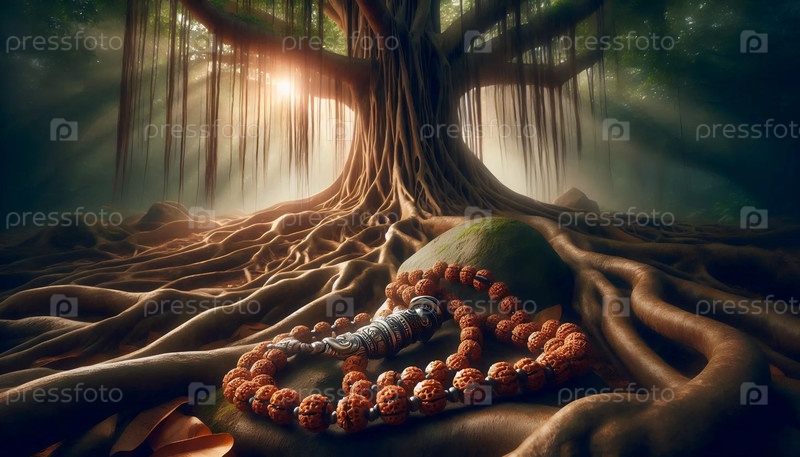 Банианское дерево с висящими бусинками Рудракши, Ai generated image