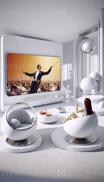Футуристическая гостиная Home of Tomorrow с прозрачной пластиковой мебелью и женщиной, дирижирующей оркестром на большом экране телевизора