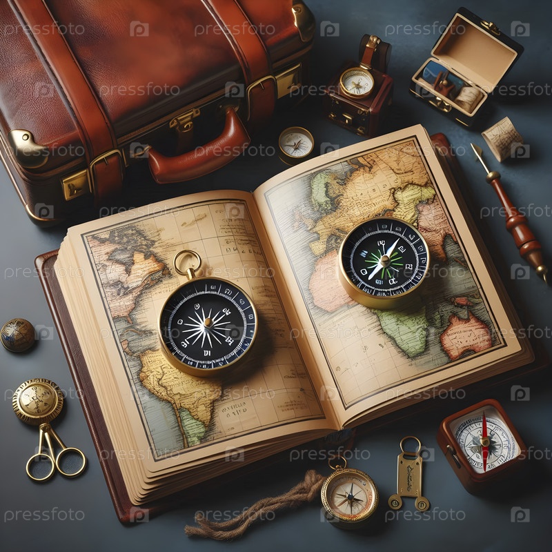 Детская книга на тему приключений, открытая к странице карты, с игрушечным компасом и миниатюрным чемоданом, Ai created image