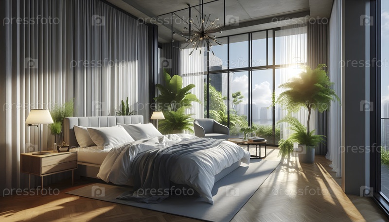 Спальня с окнами из наностекла, Ai created image