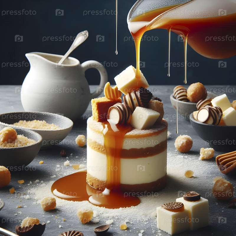 Деконструированный чизкейк, замороженные компоненты восстанавливаются при заливании теплым соусом, Ai created image