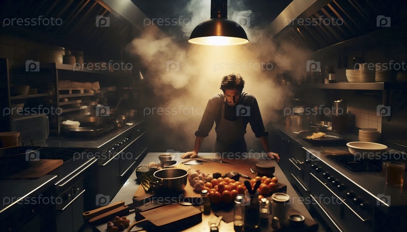 Шеф-повар в тихом, сфокусированном послеобеденном сервизе, убирающий станцию на кухне, освещенной только практическими рабочими огнями, Ай создал изображение