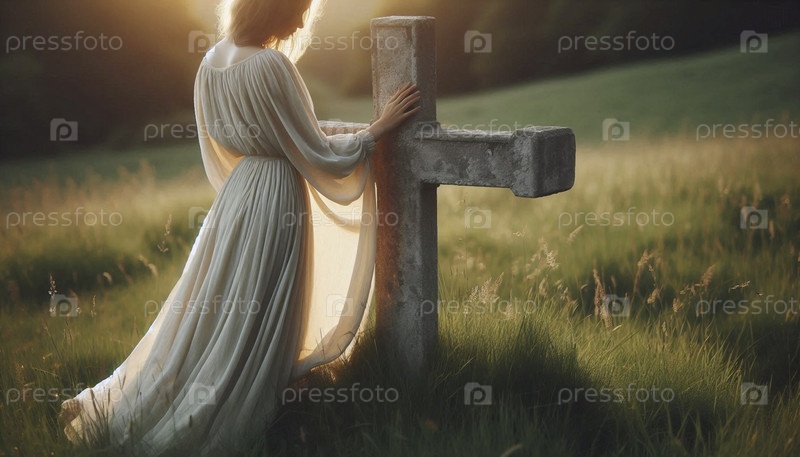Фигура сзади, касающаяся выветрившийся каменный крест в поле, Ai generated image