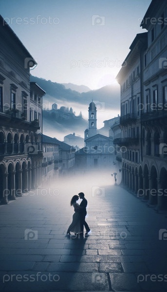 Пара, медленно танцующая посреди асфальтированной площади в небольшом европейском городке, совершенно одна на рассвете, Ai создала изображение