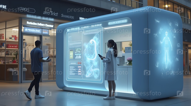 Всплывающий медицинский киоск с голографическим проверяющим симптомы, изображение, созданное искусственным интеллектом