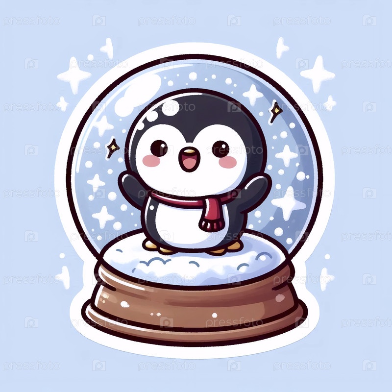 Милый стикер кавайи пингвин в снежном шаре, Ai generated image