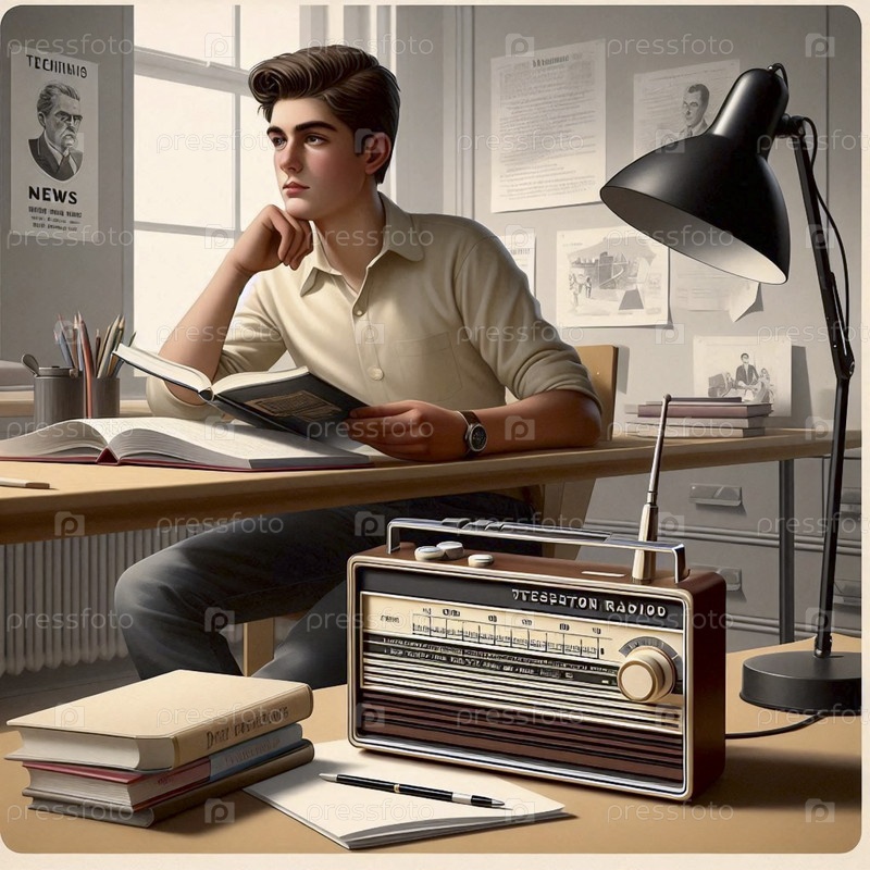 Чистый студент колледжа в свитерной жилетке, изучающий большой учебник рядом с гладким новым портативным транзисторным радио, Ai generated image
