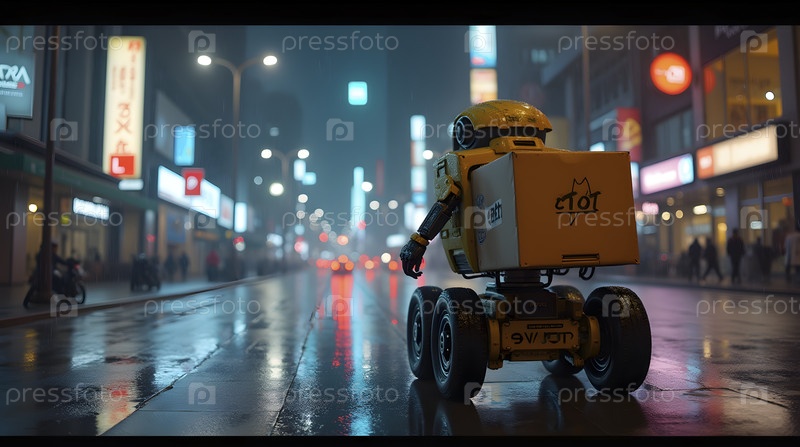Робот-доставщик, несущий посылку на дождливой городской улице ночью, Ai generated image