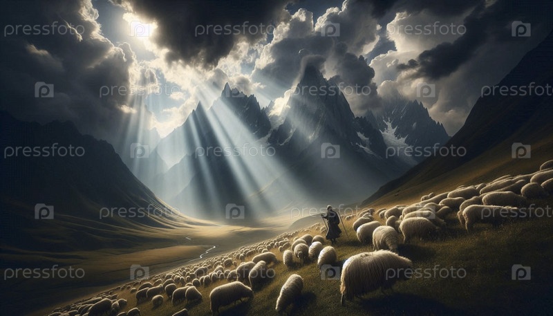 Пастух, передвигающийся со своим большим стадом через высокий горный перевал с размытыми штормовыми облаками и солнечными лучами, создающими божественный свет