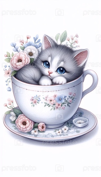 Кавайская сцена кошки в чайной чашке, Ai generated image