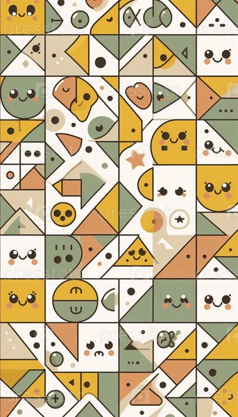 Геометрический шаблон кавайи с милыми формами лиц, Ai generated image